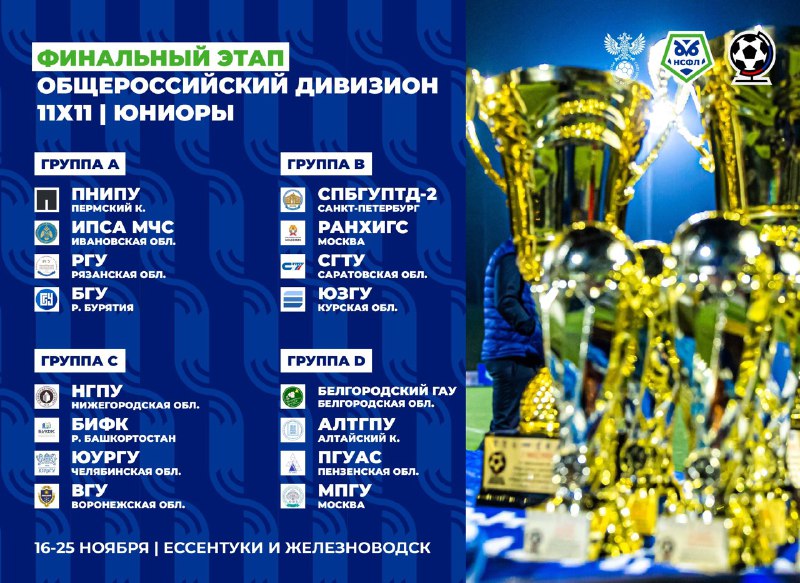 С 17 по 24 ноября команда Ивановской пожарно-спасательной академии ГПС МЧС России по футболу примет участие в финальном этапе Общероссийского дивизиона среди юниоров. Решающие матчи состоятся на двух крупных площадках: «Ессентуки Арена» в г. Ессентуки и на стадионе «Машук» в г. Железноводске.