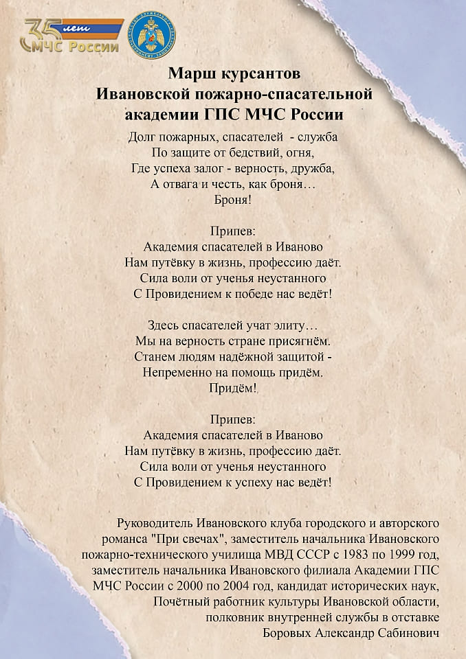 С сегодняшнего дня мы начинаем публиковать сборник авторских стихотворений личного состава Ивановской пожарно-спасательной академии ГПС МЧС России, посвященный 35-летию МЧС России. Это уникальное издание станет отражением гордости и уважения к сотрудникам чрезвычайного ведомства, их подвигам и самоотверженности.