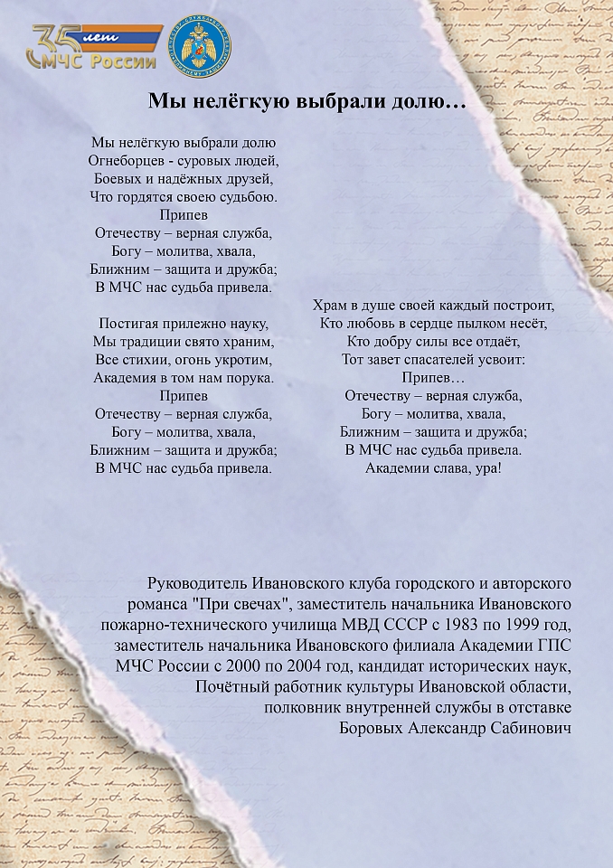 Страница 2 из 17 сборника авторских стихотворений личного состава Ивановской пожарно-спасательной академии ГПС МЧС России, посвященного 35-летию МЧС России.