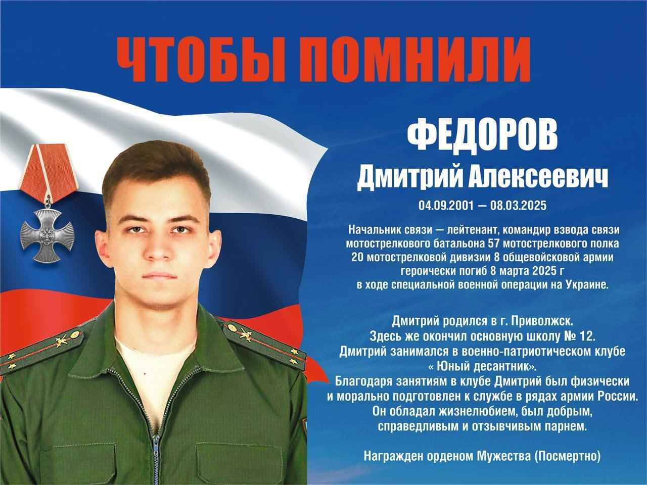 4 сентября, в день рождения Федорова Дмитрия Алексеевича, выпускника кадетского пожарно-спасательного корпуса Ивановской пожарно-спасательной академии ГПС МЧС России 2019 года, в Городском Доме культуры г. Приволжск прошло торжественное открытие памятной доски, посвященной героизму и мужеству Дмитрия, проявленных им во время специальной военной операции.