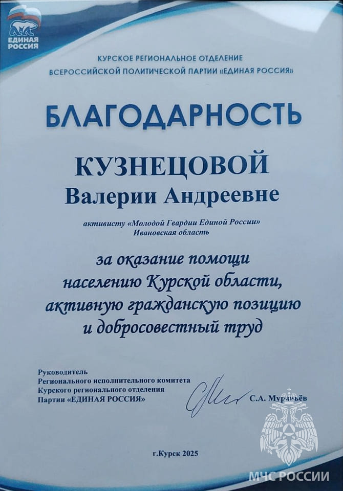 В период с 27 октября по 10 ноября студентка 4 курса Ивановской пожарно-спасательной академии ГПС МЧС России Кузнецова Валерия, совместно с сотрудником Волгоградского регионального отделения партии «Единая Россия» Гндоян Алиной, находясь в составе Всероссийской общественной организации «Молодая гвардия Единой России» выполняли ряд волонтёрских мероприятий в городе Курске.