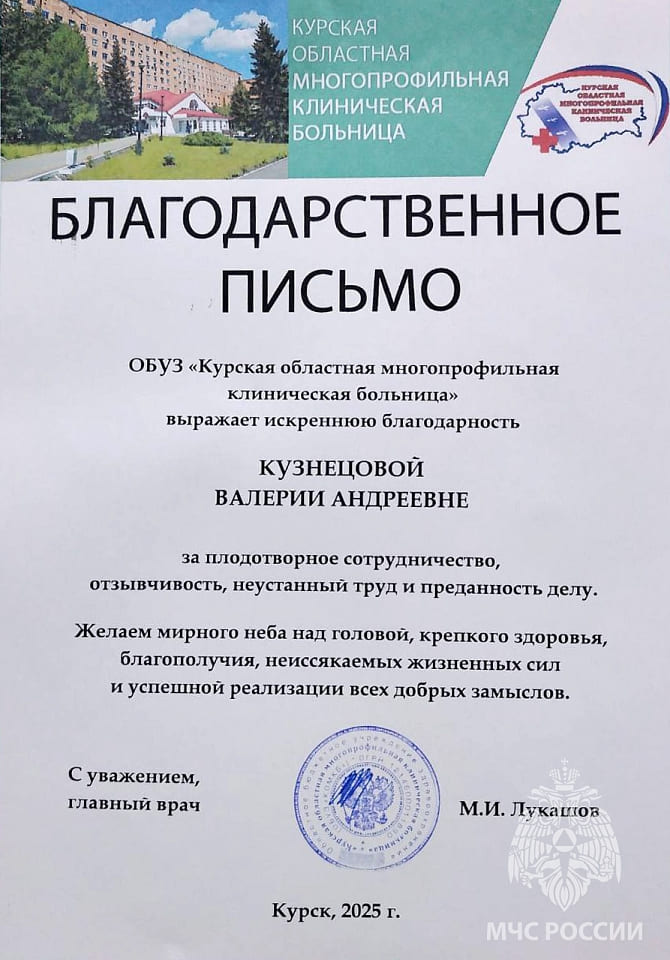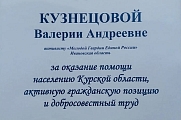 По итогам участия в волонтёрской миссии Валерия Кузнецова была удостоена благодарственными письмами. Отдельно свою признательность выразили военнослужащие расчёта беспилотных летательных аппаратов пограничного управления, работающего на Курском направлении, записав видеообращение, в котором сердечно поблагодарили девушек за оказанную помощь.