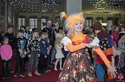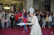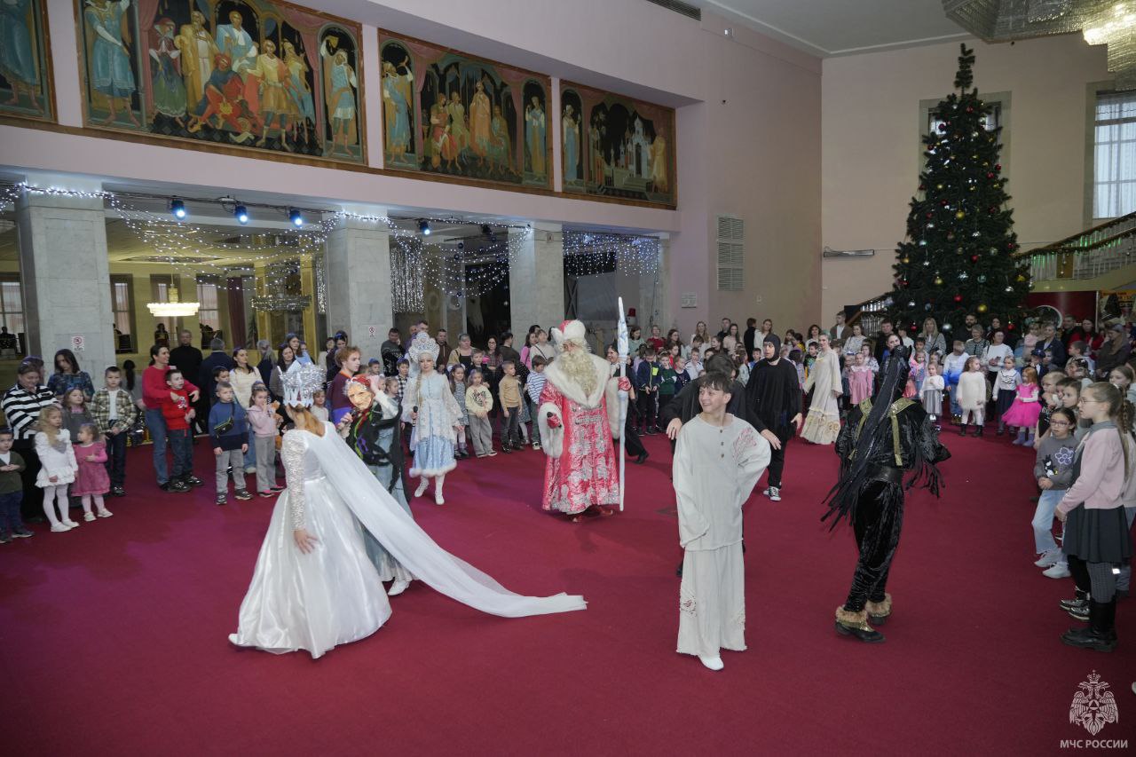 Праздничное фойе стало центром весёлых развлечений. Сказочные персонажи — Дед Мороз и Снегурочка — приветствовали ребят увлекательными конкурсами и традиционными музыкальными хороводами вокруг нарядной ёлки.