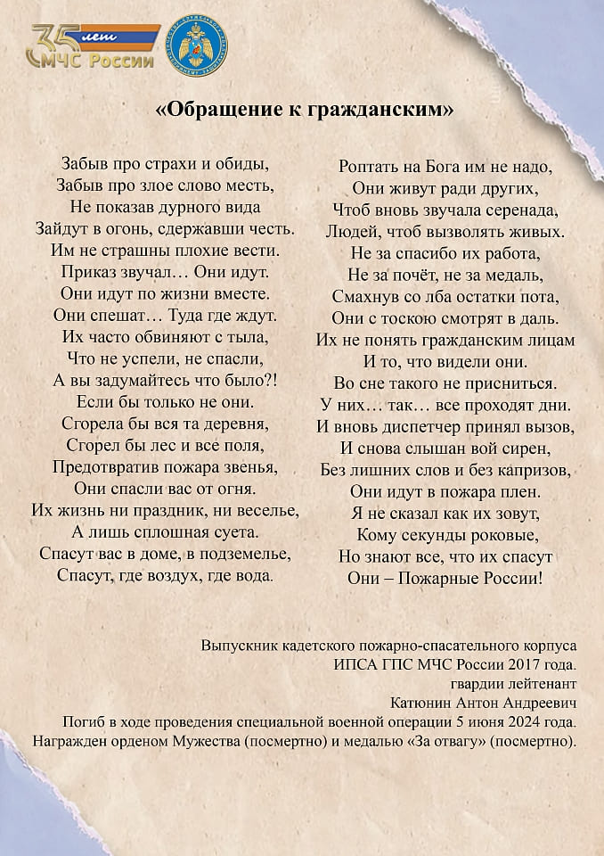 Продолжаем публиковать сборник авторских стихотворений Ивановской пожарно-спасательной академии ГПС МЧС России, посвященный 35-летию МЧС России.