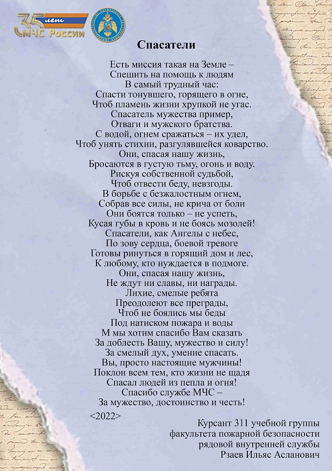 Страница 12 из 17 сборника авторских стихотворений личного состава Ивановской пожарно-спасательной академии ГПС МЧС России, посвященного 35-летию МЧС России.