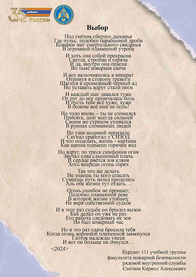 Страница 14 из 17 сборника авторских стихотворений личного состава Ивановской пожарно-спасательной академии ГПС МЧС России, посвященного 35-летию МЧС России.
