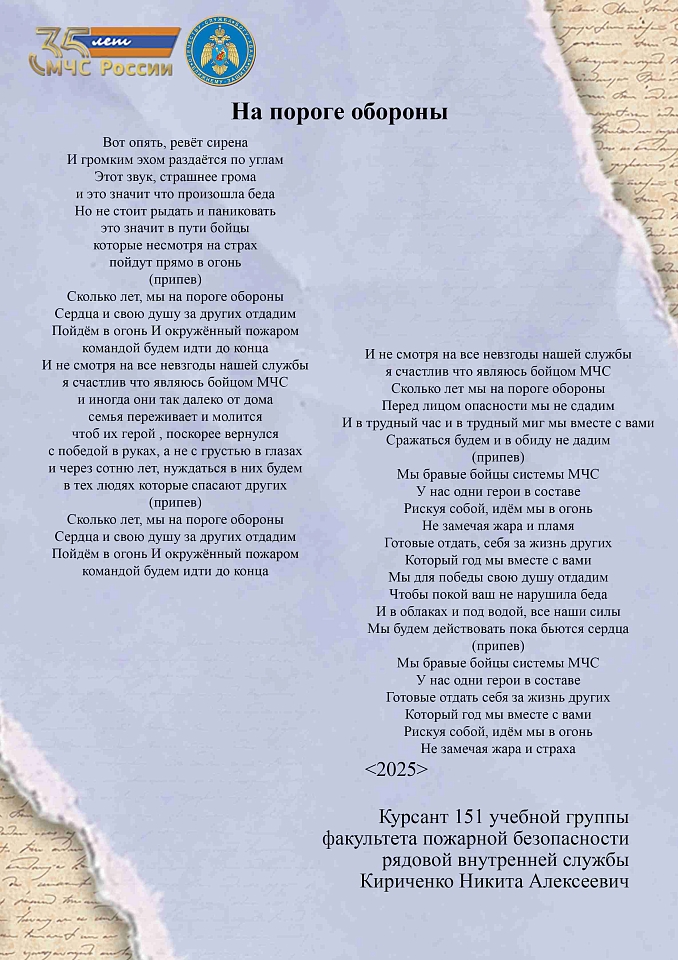 Страница 15 из 17 сборника авторских стихотворений личного состава Ивановской пожарно-спасательной академии ГПС МЧС России, посвященного 35-летию МЧС России.