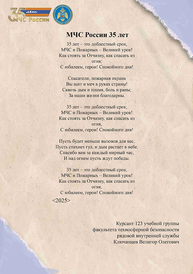 Страница 16 из 17 сборника авторских стихотворений личного состава Ивановской пожарно-спасательной академии ГПС МЧС России, посвященного 35-летию МЧС России.