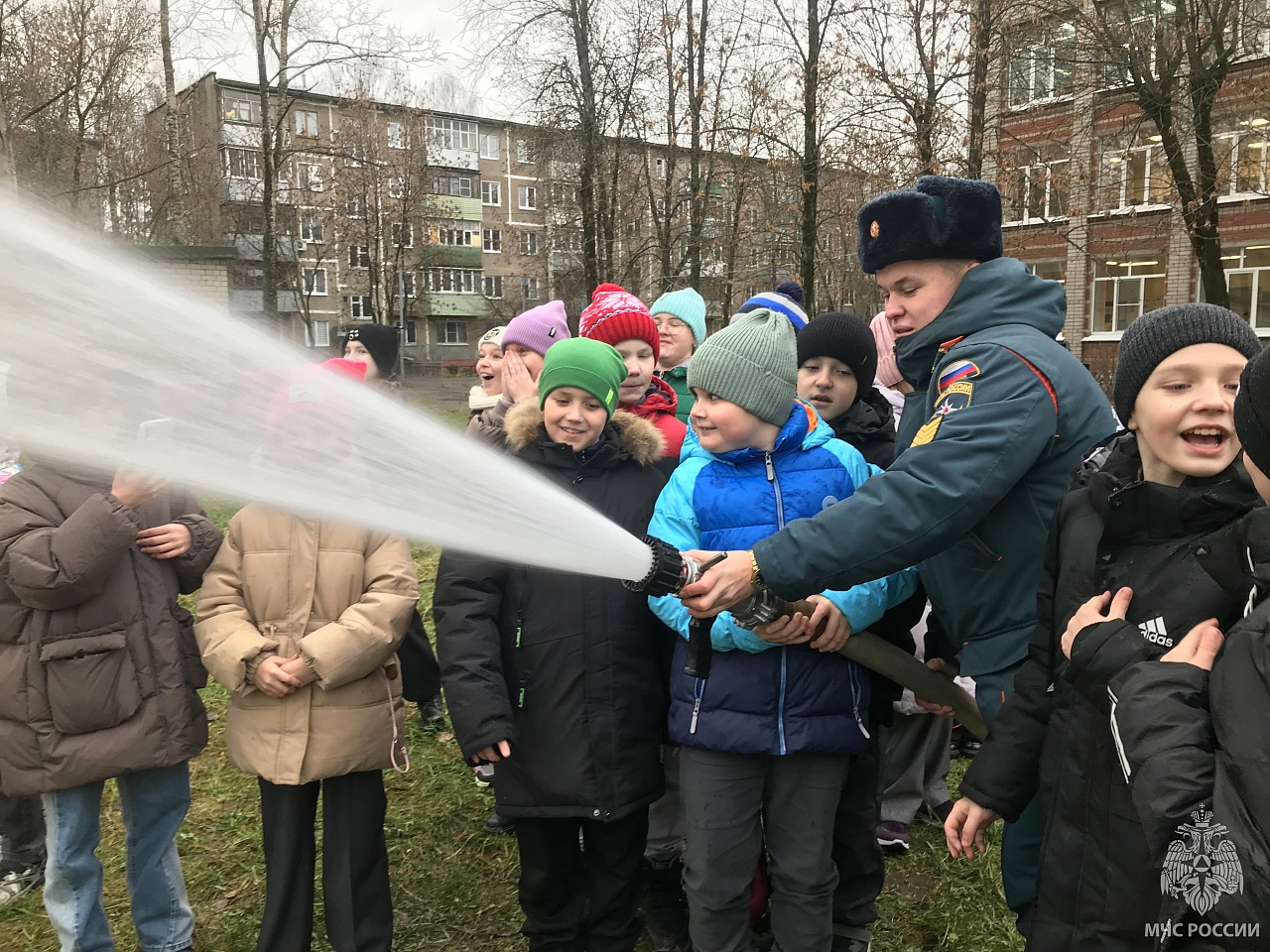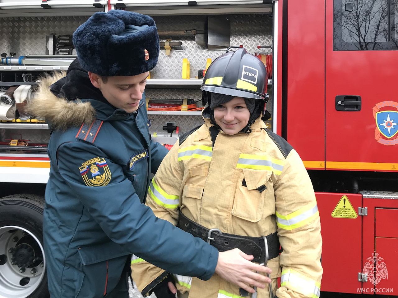 В рамках тематического занятия ребята познакомились с устройством пожарного автомобиля, его вооружением и средствами защиты. Примерили боевую одежду пожарных и попробовали подать воду из пожарного ствола.